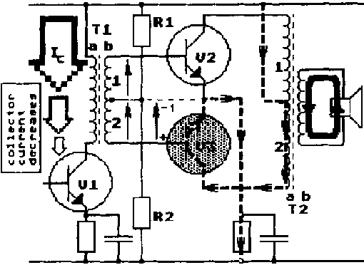 If this collector current through V1 decreases, there is a voltage induced at the secondary coil b of T1. This has here a upward direction, so we find now at the base-emitter-junction of V3 a voltage which is directed forward while at V2 it has a reverse-direction ® V3 will be conducting and ® there will flow a collector current through V2 and the part 2 of coil b of T2. This induces an opposite voltage in the secondary coil of T2 and an opposite current through the loudspeaker.