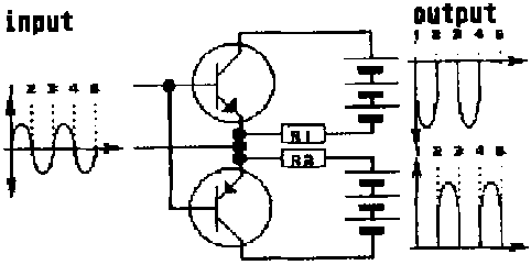 In power amplifiers of older types of receivers we find often circuits which are called PUSH-PULL-AMPLIFIERS. In this kind of an amplifier one transistor amplifies only one half of the input signal wave, the other half of the signal is amplified by another transistor.