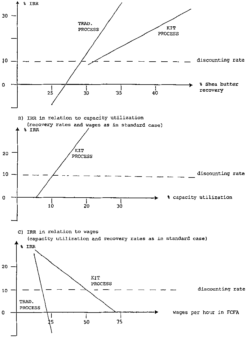 Figure 22, B, indicates the expected IRR in relation to capacity utilization (percentage of maximum capacity at 8 working hours per day and 300 working days per year). As mentioned earlier, the bottleneck factor for the utilization of the equipment might be the availability of the rawmaterial, i.e. how many shea nuts the women can collect on average. For both processes, 50 kg of kernels per woman per year had been assumed as the standard case. However; the collected amount of nuts is reported to be higher in many cases. On the other hand, less raw material might be available in years when shea nut trees bear only little fruit. A long-term deterioration of this situation due to a shortage of shea nuts (possibly in consequence of ecological problems such as desertification) has not been considered for the analysis, but might be of importance in the future.