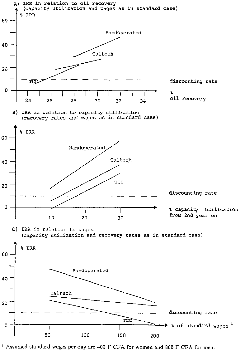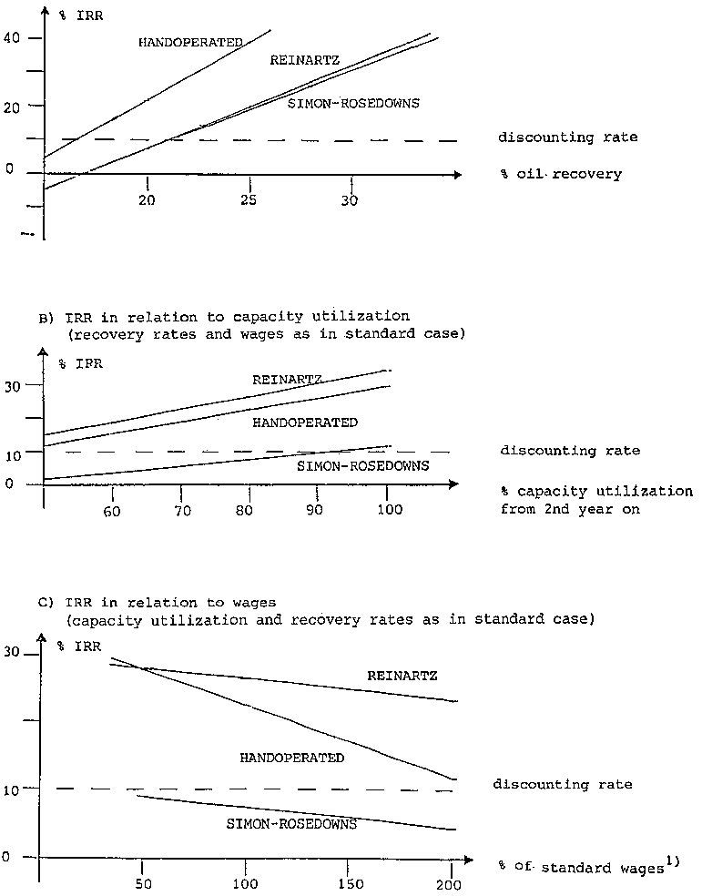 Under the assumptions made for the standard cases in Togo (for oil recovery rates, see figures in brackets above), all three processes would give satisfactory returns on invested capital, the handoperated equipment even producing a very good rate of return. The sensitivity analysis which is illustrated in Figure 24, however, indicates that the financial returns for all three processes react rather sensitively to changing oil recovery rates and wages and very sensitively to changing capacity utilization.