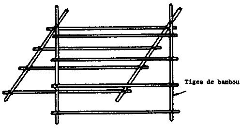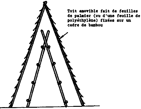 Les épis de maïs non dépanouillés sont souvent liés par leurs soies en petites gerbes qui sont suspendues à des arbres ou aux poutres extérieures des habitations. On peut aussi utiliser des râteliers de bambou constitués de tiges horizontales fixées à des tiges inclinées (figure 3). Les épis sont suspendus aux tiges horizontales par leurs soies. Pour parer aux averses, un deuxième râtelier, légèrement plus grand que le premier et recouvert dune feuille de polyéthylène, peut être placé par-dessus (figure 4).