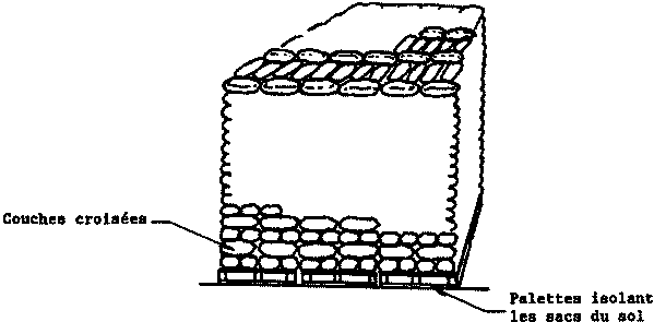 Les sacs seront empilés régulièrement et calés les uns contre les autres, en croisant les couches comme lindique le schéma de la figure 11. Lempilage devrait être serré si les grains sont bien secs. Un empilage bien fait permet de superposer 30 à 40 couches de sacs, pour autant que le magasin ait une hauteur suffisante.