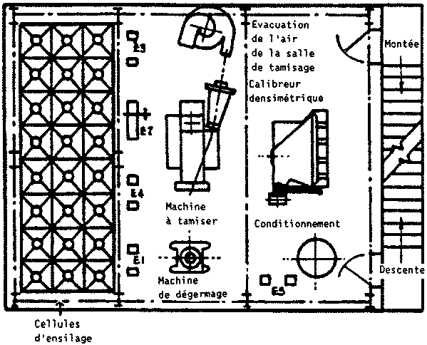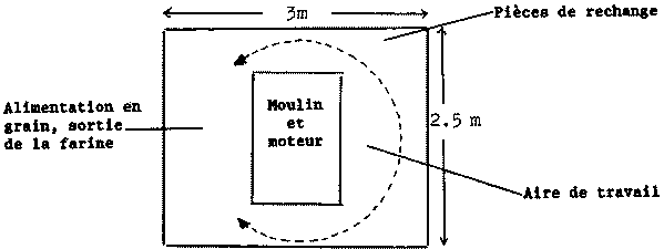 La figure 46 illustre la disposition type dun moulin à meules de pierre horizontales fonctionnant à lélectricité et ayant une capacité de production de 2 t de maïs par poste de 8 h (moulin n°2 du tableau 10). Il sagit dun moulin à façon ne comportant aucune aire de stockage, les clients apportant leur grain et repartant avec la farine complète.