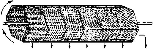 - calibreuse à vibrations: il s'agit d'un tamis posé sur un cadre secoué manuellement ou mécaniquement. Des tamis de diamètres différents peuvent être superposés pour répartir les légumes de différents calibres en une seule opération;- calibreuse à tambour rotatif (figure 8): un cylindre rotatif à axe légèrement incliné est perforé de trous ou de fentes de calibres croissants par lesquels passent les légumes. Les légumes fragiles sont calibrés par vibration, les autres dans un tambour rotatif.