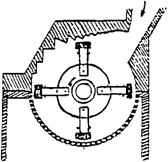 - broyeurs à marteaux (figure 15): plusieurs jeux de marteaux (jusqu'à 6) sont disposés radialement sur un rotor qui tourne à 1000-1500 tours/mn dans un carter muni d'une grille perforée semi-circulaire tenant lieu d'enclume. Les perforations de ces grilles interchangeables varient entre 3 et 5 mm de diamètre. Ce type de broyeur présente l'avantage d'une grande robustesse; il peut résister aux pierres et aux cailloux et être fabriqué localement;- broyeurs à couteaux: à la différence des broyeurs précédents, ces appareils sont munis d'une multitude de lames bien aiguisées fixées sur un rotor tournant à 1.000 tours/mn environ.
