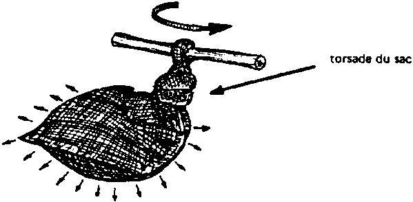 - pressage par torsion d'un sac en fibres textiles tissées ou tressées contenant la matière à presser (figure 16). Ce système ne peut être utilisé que pour de très petites quantités au niveau familial;- pressage de pulpe en sacs disposés dans un panier sous une charge de grosses pierres.