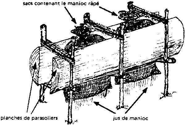 Le pressage s'applique plus particulièrement au manioc ayant subi un rouissage ou à la pulpe de manioc en cours de fermentation. Il a pour but d'éliminer une partie de l'eau en comprimant le produit, de façon à accélérer l'étape suivante de séchage proprement dit.