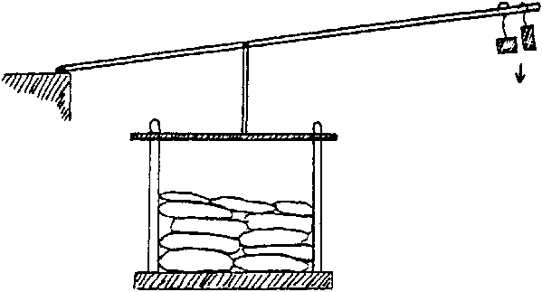 - pressage de sacs contenant le produit et disposés entre des planches maintenues au moyen de cordages (figure 17). Comme les systèmes précédents, il est très facile à installer, mais moins aisé à mettre en oeuvre;- presse à levier (figure 18): un levier soumis à un poids provoque la descente du plateau qui comprime les sacs de produits disposés en dessous;