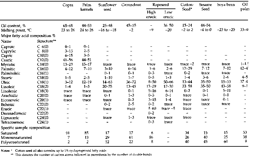 Analytical chemists are able to measure the overall proportions of the different fatty acids present in an oil or fat. The fatty acid composition of the oil tends to be characteristic of the oilseed from which it is extracted. The fatty acid compositions and melting points of oils from different oilseeds are given in Table 2, together with the oil contents of the seeds.