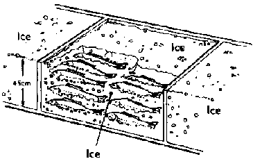 Ice must be layered between and thoroughly mixed with the fish, with a thick layer (5 cm) around the sides, top and bottom of the container. Ice cannot cool the fish properly if it is only put on the top, sides or bottom of the container.