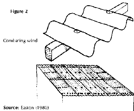 Timber roofs should be connected to masonry walls with a fastening strap or reinforcing bar that is firmly embedded in the concrete or masonry. If timber walls are used it should be ensured that nails are driven in so they act in shear rather than in tension. Purlins should be tied to rafters with strap connectors. When nailing corrugated roof sheeting, the top of the corrugations should be nailed through and a washer at least 20 mm (3/4 inch) in diameter used. Every corrugation of roof edges and every other corrugation elsewhere (see Figure 2) should be nailed.