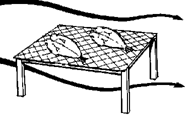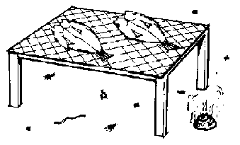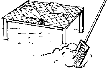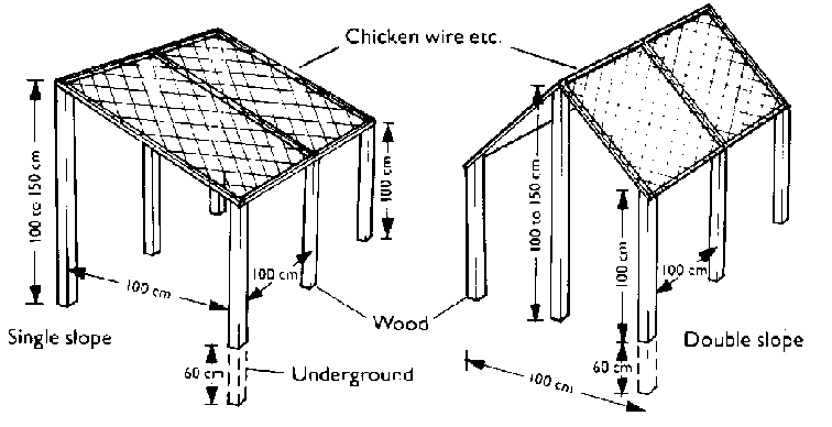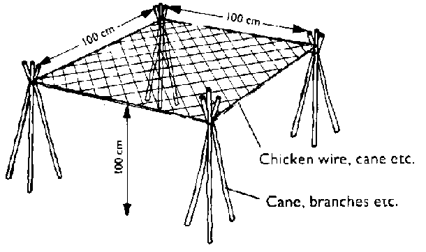 Figure I shows a rack with a flat top. To make the rack, 160 cm lengths of timber should be cut. These are then buried in the ground to a depth of about 60 cm. They are arranged about 100 cm apart in two lines, the distance between the posts being the width of the drying rack. Lighter pieces of wood or bamboo are fixed between the top of the posts. Material, such as chicken wire, mosquito netting, old fishing nets, reeds or coconut matting, is then fixed to these canes to support the fish.