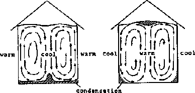 If the outside walls of a store are warmed up by sun radiation, the inside air close to the walls will also be heated. The increase in its temperature will cause the relative humidity to drop. The air is thus able to absorb additional moisture from the stored produce. If this air then comes into contact with colder surfaces, it will cool down. The drop in its temperature will cause the relative humidity to rise, possibly even passing saturation point. Condensation will occur. The same applies if the outside temperature is lower than the temperature inside the store.