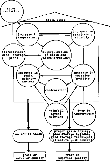 High temperatures, high relative humidity and high moisture contents of stored produce are favourable to the development of pest organisms. The respiration of pests (and of the stored produce) releases moisture and heat, which further improves the living conditions and leads to an increase in the pest population.