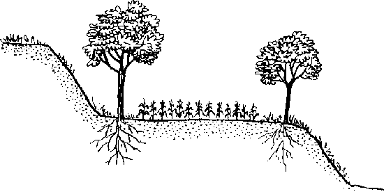 In arid and semi-arid areas it is almost impossible to get the seedlings to survive without some water conservation measures. In high rainfall areas and on unstable soil, particularly on slopes, the soil often needs to be protected against erosion until the tree crowns shelter the site. The aim of all soil and water conservation measures is to reduce or retard the flow of surface run-off water (water harvesting). This will diminish the erosion damage and cause the water to soak into the soil, increasing the amount of soil moisture available for the seedling.