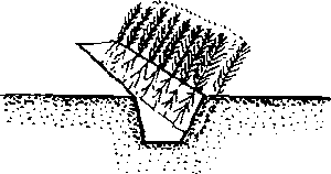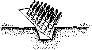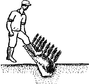 Separate the seedlings from the bundles. On one side of the trench, which should be slightly sloping, arrange the seedlings individually in upright position. Cover the roots with soil taken from the opposite side of the trench, thus making room for the next row of seedlings. The roots should be covered up to, or a little above, the root collar. Firm the soil with the hands. Then place the next row of seedlings. During dry weather the seedlings have to be watered. If the location is not very shady, the seedlings should be covered by brush to discourage the emergence of shoots.