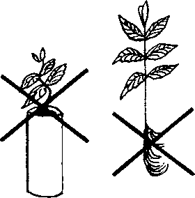 Common mistakes in handling seedlings Poor planting stock is not sorted out leading to low survival. The seedlings are pulled by the shoots, thereby breaking them and causing deformation of the future trees. Containerized seedlings are not transported upright and well secured. The earth-balls around the roots break up and therefore the advantage of using an expensive containerized seedling is lost at the last moment. Seedlings are stored too long before planting. Seedlings are not adequately protected against drying out. |