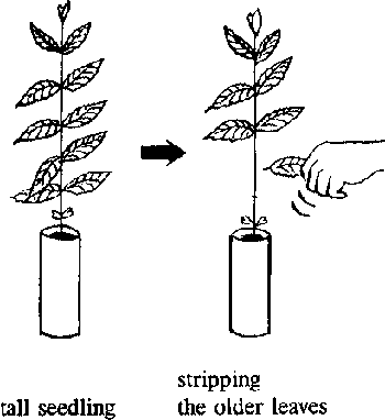 With tall, broadleaved species, young shoots and part of the foliage must be trimmed or stripped off to reduce transpiration until the roots have had a chance to reestablish their water supply function. Some species such as Azidirachta indica and Khaya senegalensis should be stripped of all leaves except for the terminal bud and two or three near it. Remove the leaves carefully. The terminal bud must not be damaged. If possible the plants should be stripped in the nursery before lifting out.