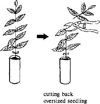 Overgrown seedlings of some broadleaved species like Eucalyptus can be trimmed back to the right root: shoot ratio with a pruning shear. After planting they survive much better than seedlings that are too large.