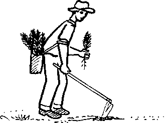 If the holes have not been made beforehand, the work may be conducted by gangs of two workers. The first digs the planting hole, the second distributes the plants and completes planting. On difficult sites more diggers than planters have to be assigned. Where holes are more easily dug, the ratio may be reversed. Another method is to let one worker distribute the plants to 10-20 planters who will dig the holes and plant. One single worker may also complete the whole operation of digging, carrying the seedlings and planting.