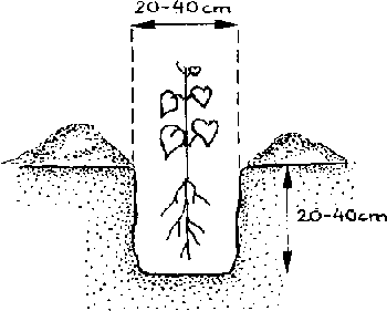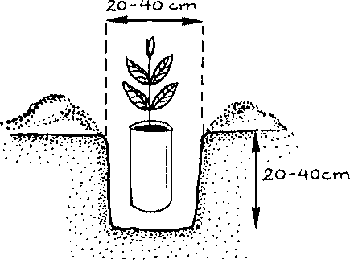 For containerized forest trees the holes should be about 20-40 centimetres in diameter and slightly deeper than the length of the container. For fruit trees the hole should be larger (up to 60 x 60 x 60 cm). The harsher the site, the deeper the holes should be.