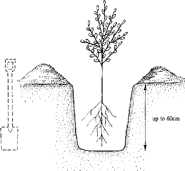 For bare-rooted seedlings make sure that the hole is deep enough to allow the taproot to hang down vertically without bending its tip.