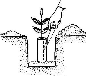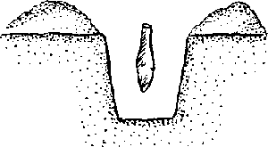 A wooden dibble or an iron bar can be used when planting cuttings. If loose soil is not available all over the site, extra soil has to carried for filling the holes. Dibbles or bars should only be used in sandy soil, which is not likely to become compacted.
