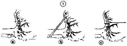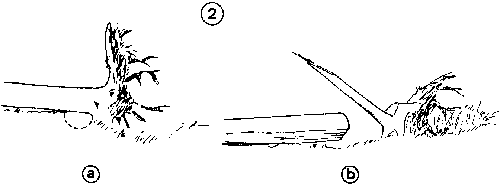 In loose soil, the base of the tree may be pressed on the ground. In this case, it is necessary to dig a trench to allow salvage of the valuable butt end (2a).