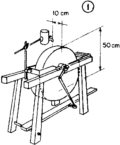 For sharpening axes, debarking spades and other cutting tools, revolving grindstones operated by hand or foot are used for regular overhauls (1). They should have a minimum diameter of 50 cm and a minimum width of 10 cm, be made of sandstone or appropriate artificial material and be used with water. When not in use, the stone must be kept dry to prevent moisture softening the part of the stone under water. From time to time, the stone must be "dressed", that is, restored to its original circular shape.