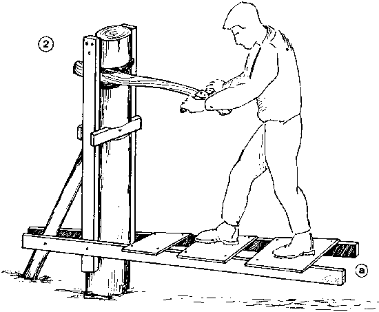 This simple construction made from wood and two pieces of an old tyre (1a) is very practical for holding a piece of wood when making a handle.