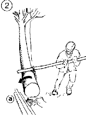 Heavy trees which cannot be dislodged by manual work should be pulled down with draught animals or a skidding tractor (2). The tractor or animals must be placed at a safe distance from the lodged tree and the cable winch used.