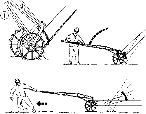 If lodging occurs frequently, a sulky may be a convenient aid for lifting the tree up from the stump and to pull it down (1). The sulky may also be used to skid it to the skidding line. Sulkies are an excellent means of facilitating this heavy and dangerous job. Their use is restricted to trees up to a volume of about 0.5 cubic metres. Sulkies can be made in local workshops.