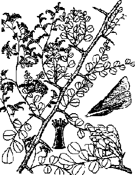 Branchlets are clustered at the nodes. Some grow out, while others are short and spine tipped. They are covered at first with short crisp hairs, and are usually glabrous. Leaves are alternate, pinnately compound and 6 to 22 cm long. The fragrant white flowers are 6 to 9 cm long, occurring in dense clusters. There are usually nine stamens, united or variously divided. Pods are elliptic oblong or irregularly oblong, bluntly pointed, flat and thin. They range from 3 to 7 cm long and 0.8 to 1.4 cm wide. They tend to be papery, glabrous, and laxly and rather diffusely veined, with one or two seeds.