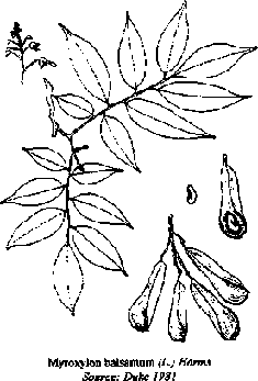 Myroxylon balsamum (L.) Harms (family Legununosae, subfamily Papilionoideae) grows to 34 m in height and 1 m in diameter. The bark is generally gray and spotted with yellow rough areas. The 3-11 leaves are alternate, evergreen and oddly pinnate, 6-9 cm long and 3-4 cm wide (Duke 1981), and have scattered, translucent, glandular oil dots or lines (Allen and Allen 1981). Flowers are whitish, and the corolla contains 5 petals (Fuentes, 1993). The winged pod is 8-13 cm long and 2.5 cm broad and contains one seed at the tip (Duke 1981).