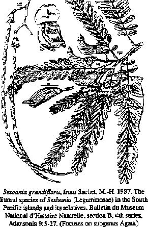 Sesbania grandiflora (L.) Poir. is a tree that grows to 8-10 m in height The pink-red or white flowers of this papilionaceous (pea-like flowered) legume are unusually large (5-10 cm in length and about 3 cm wide before opening); this novelty may be the principal reason for grandiflora having been distributed by man throughout the tropics and subtropics. Within its genus, S. grandiflora is a member of the subgenus Agati, and it is thus more closely related to the unusual littoral sesbanias of Pacific islands than to the more typical sesbanias of subgenus Sesbania, such as the perennial S. sesban and the annual sesbanias grown for green manure (such as S. cannabina).