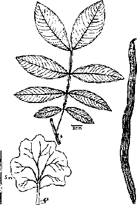 The leaves are once pinnate, up to 24 cm long, with 4 to 6 pairs of opposite leaflets. The terminal pair of leaflets is larger than the basal pair and can be up to 18 cm long and 11 cm wide. Between each leaflet there is a nectary gland on the leaf rhachis; in 1. edulis these are large (2 to 3 mm) and squashed transversely, an important character for identifying the species. The leaflets and rhachis are covered in dense, short, rough brown hair. The seedlings have a characteristic grayish sheen on the upper leaf surface.