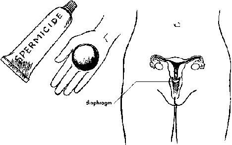 DIAPHRAGM: A rubber cup with a flexible rim. It is inserted into the vagina before intercourse and placed so that it covers the opening of the womb. |