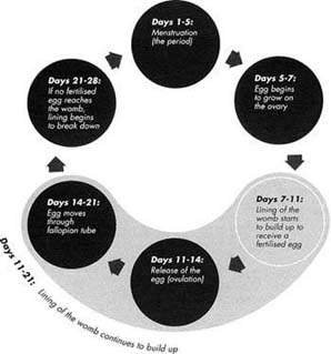The length of the menstrual cycle is the interval from the beginning of one period to the beginning of the next period (see Figure 4.1). It is usually about 28 days but can vary between 21 and 35 days, or even more. The length of each period, as well as the amount of bleeding, varies from woman to woman. It may also vary in the same woman from time to time. For the first couple of years that a girl has her periods, they may not occur regularly. The same is true for women who are going through menopause, when the periods gradually stop coming altogether. In addition, other factors such as illness, anxiety, or depression can speed up, delay, or prevent menstruation (see Chapter 20). A woman who is very thin or who exercises a great deal may also not menstruate regularly.