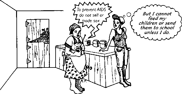 Placing the blame on any group of people (such as sex workers, homosexuals, or drug users) makes others think that only that group is at risk. It is true that some people, like sex workers, may be more likely to get AIDS (because their work requires that they have sex with many men). But everyone - especially young women - is at risk for AIDS. And every person in the community needs to take responsibility for fighting it.