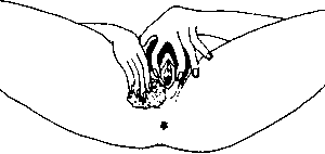 8. If you do this for yourself, use a mirror to help you see where the urinary opening is, and use your pointing (index) finger and third finger to hold the folds of the vulva open. The urinary opening is below the clitoris almost at the opening to the vagina.