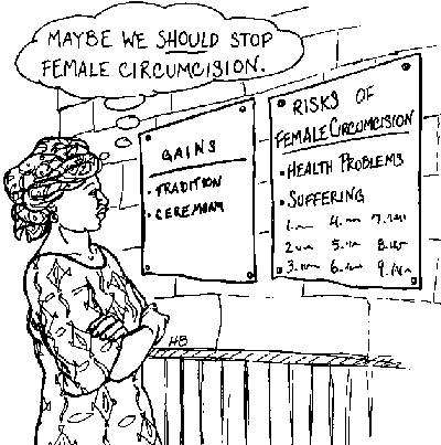 If you are not sure how you feel about female circumcision, weigh the risks to help you decide. Are the benefits of being circumcised worth the health problems? Culture is always changing to meet new community needs. Can this practice also be changed?