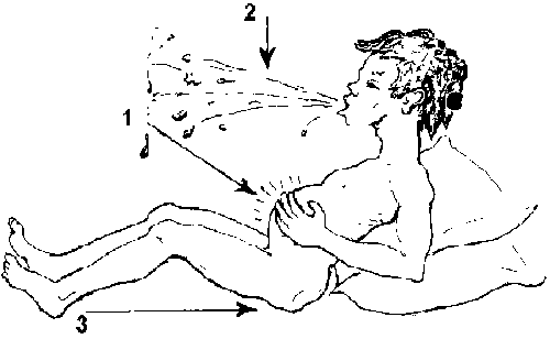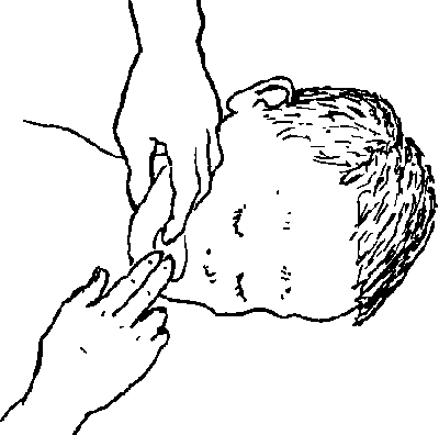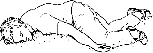 · Lay him on his side with his head low, tilted back and to one side (see above). If he seems to be choking, pull his tongue forward with your finger.· If he has vomited, clear his mouth immediately. Be sure his head is low, tilted back, and to one side so he does not breathe vomit into his lungs.