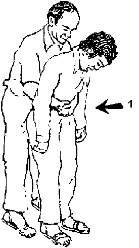 This forces the air from his lungs and should free his throat. Repeat several times if necessary.