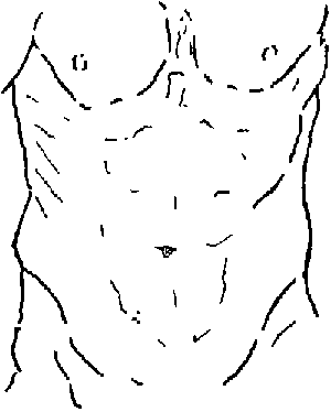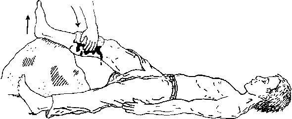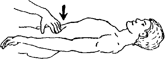 · Sit over him like this, with the heel of your lower hand on his belly between his navel and ribs. (For fat persons, pregnant women, persons in wheelchairs, or small children, place hands on the chest, not the belly.)