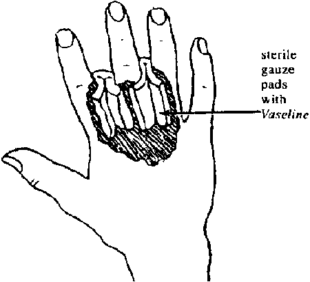Since the danger of infection is very great in these cases, it is always better to get help from a health worker or doctor in caring for the injury. Clean the wound and the exposed bone very gently but thoroughly with cool, boiled water. Cover with a clean cloth. Never put the bone back into the wound until the wound and the bone are absolutely clean.