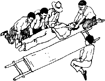 If there is any chance a person's back or neck has been broken, be very careful when moving him. Try not to change his position. If possible, bring a health worker before moving him. If you must move him, do so without bending his back or neck. For instructions on how to move the injured person, see the next page.