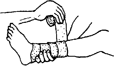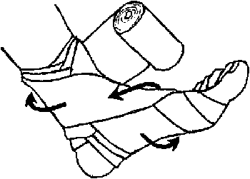 Wrapping the foot and ankle with an elastic bandage will also prevent or reduce swelling. Start from the toes and wrap upward, as shown here. Be careful not to make the bandage too tight, and remove it briefly every hour or two. Also take aspirin.