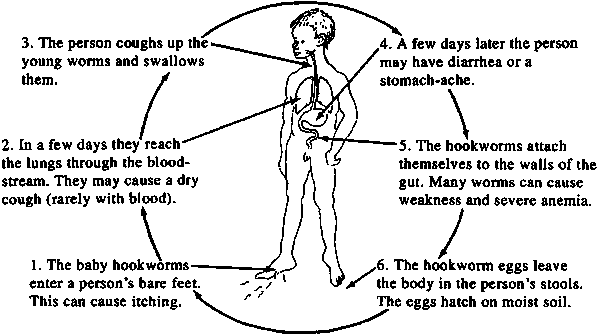 3. In areas where hookworm is common, do not go barefoot or allow children to do so. Hookworm infection causes severe anemia. These worms enter the body through the soles of the feet.