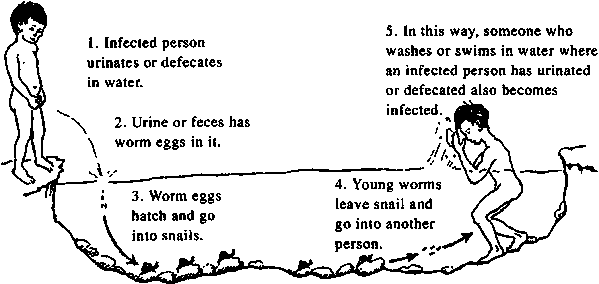 To prevent schistosomiasis, cooperate with programs to kill snails and treat infected persons. But most important: Everyone should learn to use latrines and NEVER URINATE OR DEFECATE IN OR NEAR WATER.