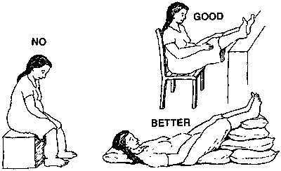· Do not spend much time standing or sitting with your feet down. If you have no choice but to sit or stand for long periods, try to lie down with your feet up (above the level of the heart) for a few minutes every half hour. When standing, try to walk in place. Or, repeatedly lift your heels of the ground and put them back down. Also, sleep with your feet up (on pillows).· Use elastic stockings (support hose) or elastic bandages to help hold in the veins. Be sure to take them off at night. (1)